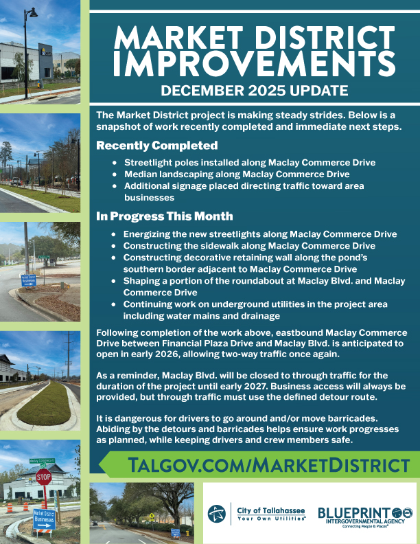The City of Tallahassee completed the West Stormwater Facility in August 2023. This portion of the project included construction of a roughly 8‐acre wet detention pond that serves as a regional stormwater facility for a large part of the Market District. The facility provides water quality treatment and protection against flooding for the entire 300-acre watershed that drains to it, including the pending roadway improvements on Maclay Boulevard and Maclay Commerce Drive and the future park being implemented by Blueprint.